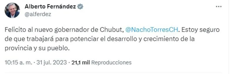Alberto Fernández, felicitó a Ignacio "Nacho" Torres por el triunfo en las elecciones en Chubut. El Presidente escribió: "Estoy seguro de que trabajará para potenciar el desarrollo y crecimiento de la provincia y su pueblo".