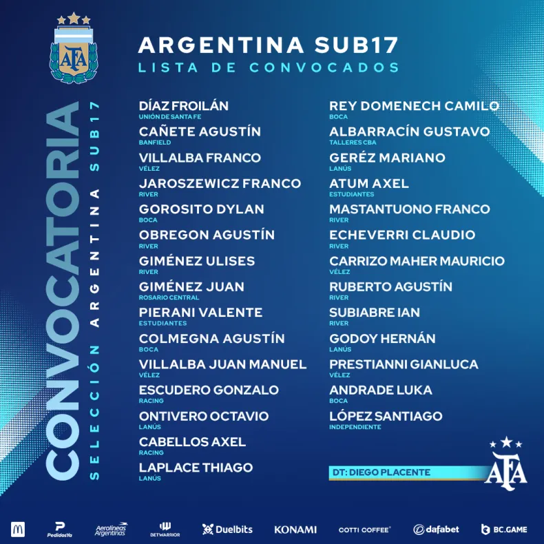 La nómina completa de convocados es la siguiente: Froilán Díaz (Unión de Santa Fe); Agustín Cañete (Banfield); Gianluca Prestianni, Mauricio Carrizo Maher, Franco Villalba, Juan Manuel Villalba (Vélez); Agustín Obregón, Ulises Giménez, Agustín Ruberto, Ian Subiabre, Claudio Echeverri, Franco Mastantuono, Franco Jaroszewicz (River); Luka Andrade, Camilo Rey Domenech, Agustín Colmegna, Dylan Gorosito (Boca); Juan Giménez (Rosario Central); Axel Atum, Valente Pierani (Estudiantes); Axel Cabellos, Gonzalo Escudero (Racing); Hernán Godoy, Mariano Gerez, Thiago Laplace, Octavio Ontivero (Lanús); Gustavo Albarracín (Talleres); y Santiago López (Independiente).