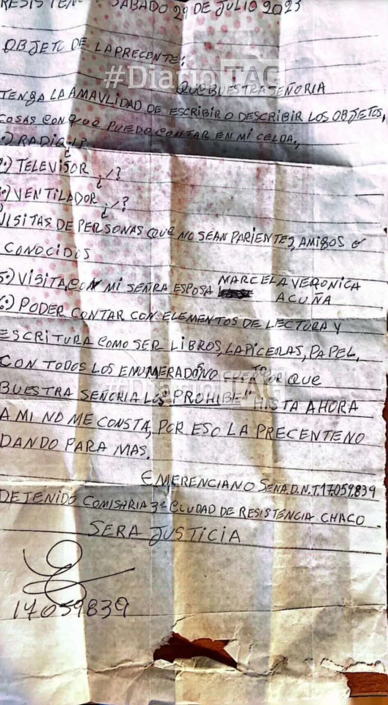 La carta fue escrita de puño y letra y dirigida a los fiscales de Resistencia, donde Sena además solicitó la visita de su esposa y la visita de "personas que no sean parientes, amigos o conocidos".