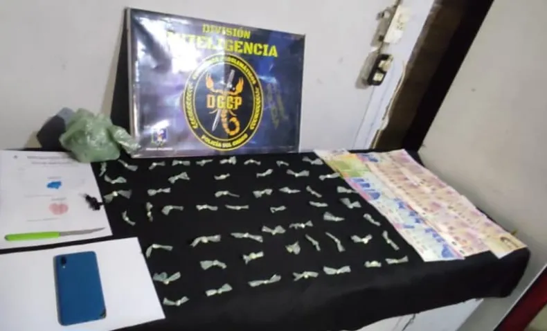 En este contexto, luego de ponerle en conocimiento de la labor de registro en su casa que realizan los antinarcóticos, se inició la inspección de los ambientes, detectando 17 dosis de cocaína, arrojando el peso de 8 gramos, una bochita conteniendo 1,5 gramos de marihuana, dinero por la suma de $ 68.670, varios recortes de bolsas, una tijera y un celular.