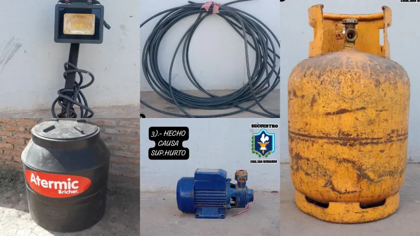 Una vez que los agentes llegaron al lugar, pudieron recuperar una bomba de agua, una garrafa, un tanque de agua y un reflector. Estos elementos fueron robados hace un tiempo atrás y, ante este hecho se logró la detención de dos jóvenes de 22 y 23 años.