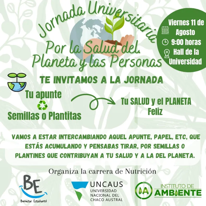 La carrera de Licenciatura en Nutrición de la Universidad Nacional del Chaco Austral, junto al Instituto de Ambiente y la Secretaría de Bienestar Estudiantil, invitan a participar de una Jornada por el cuidado de la salud del planeta y las personas.