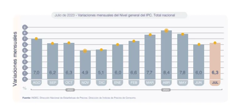 El estudio realizado por el INDEC demostró que en el mes de julio la inflación fue del 6,3%, mientras que la interanual alcanzó el 113,4%. Los datos se desprenden del Índice de Precios al Consumidor de la institución.