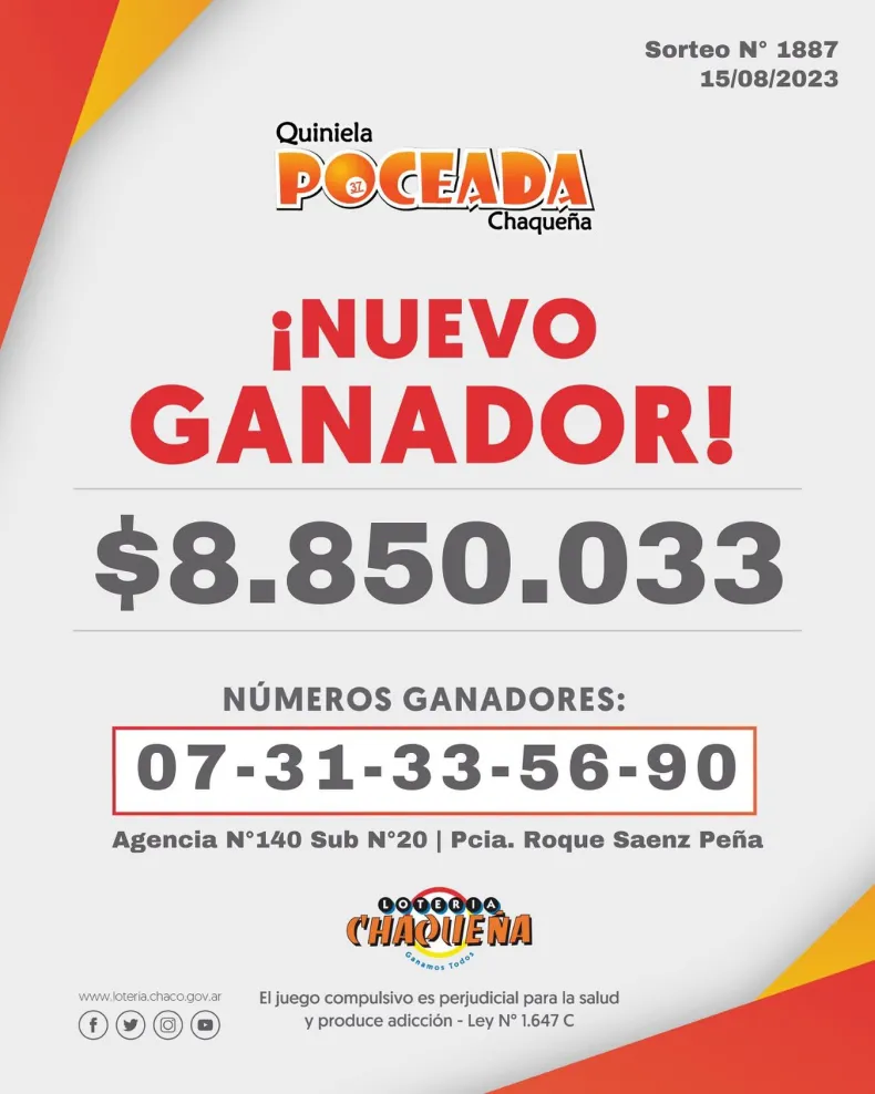 La Poceada Chaqueña dejó un nuevo ganador en la provincia con el sorteo de este martes: esta vez la suerte llegó a la ciudad de Presidencia Roque Sáenz Peña.