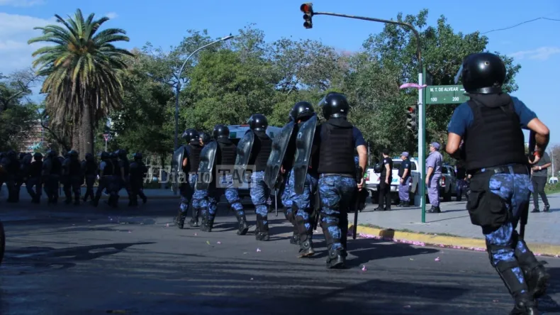 Ante esto, la Policía procedió a desalojar a los protestantes. Como respuesta, los manifestantes se tornaron violentos hacia el personal policial arrojando todo tipo de elementos contundentes . Finalmente, siete personas fueron demoradas por los agentes. Además, se secuestraron varios de los elementos pertenecientes a los movimientos.
