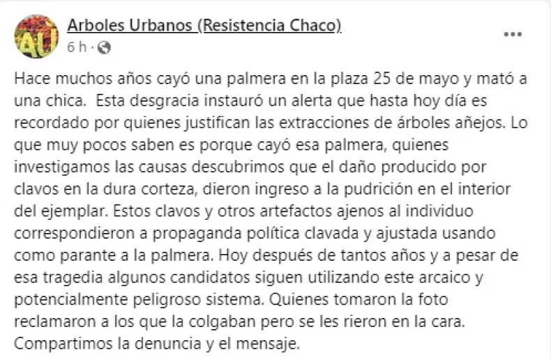 Desde la ONG, "Árboles Urbanos" formada en 2010 recordaron este martes el caso de una joven de 21 años, que en el año 2001 falleció aplastada por una palmera en medio de una tormenta.