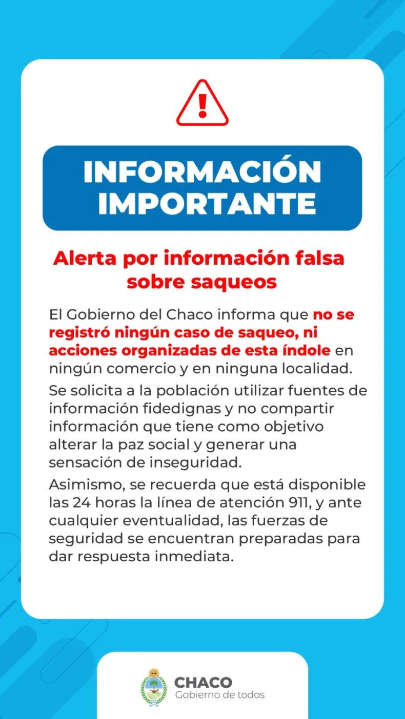 En la noche de este martes, comenzó a surgir a través de redes sociales de usuarios particulares un rumor de que en el centro de la ciudad de Resistencia había grupos organizados para realizar saqueos a los locales comerciales del centro. El Gobierno de la provincia desmintió esta información y aseguró que no hubo ninguno.