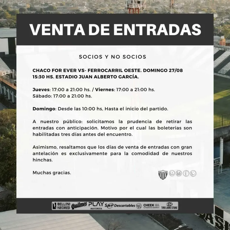 Este jueves 24, desde el club Chaco For Ever se dará inicio a la venta de entradas para el partido del domingo 27 de agosto que se jugará a las 16:30 horas en el "Gigante de la Avenida".