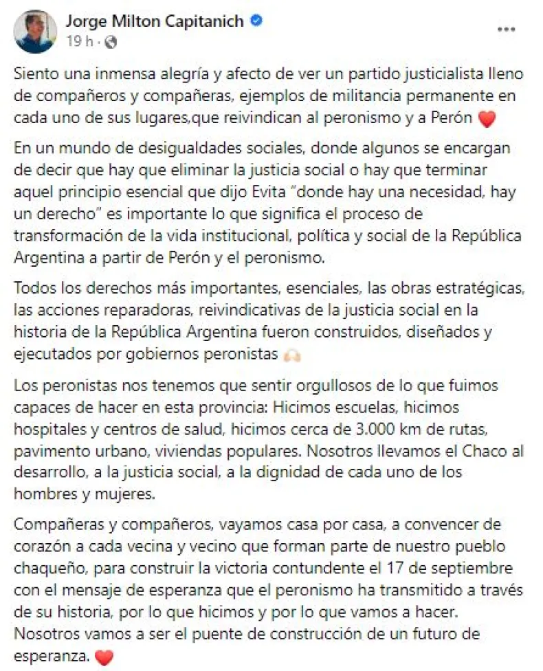 Este domingo, el gobernador, Jorge Capitanich, publicó un mensaje de cara a las elecciones del próximo 17 de septiembre, donde pidió a los candidatos y dirigentes de su espacio "convencer de corazón a cada vecina y vecino" para "construir la victoria contundente".