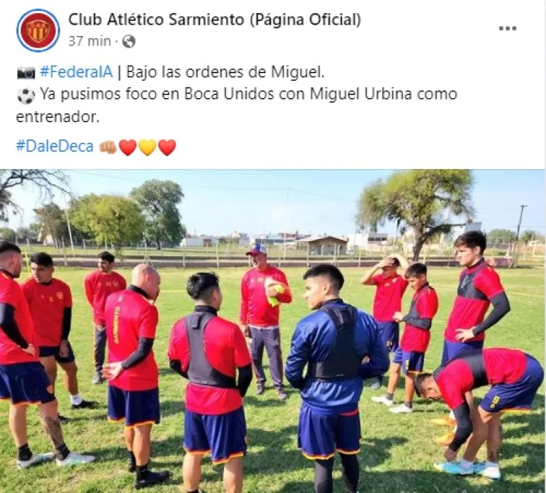Desde la cuenta oficial de Facebook del Club Sarmiento, este martes escribieron: "Federal A: Bajo las ordenes de Miguel" y agregó: "Ya pusimos foco en Boca Unidos con Miguel Urbina como entrenador".