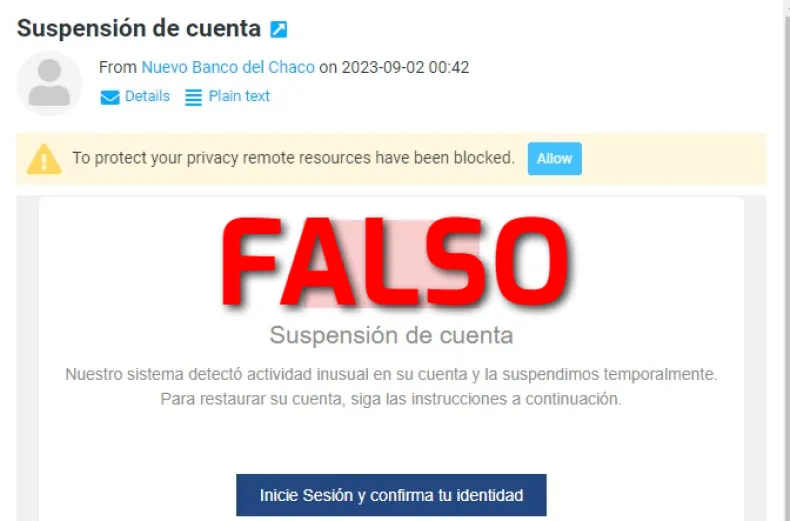 Nuevo Banco del Chaco advierte a la comunidad para evitar engaños y prevenir estafas a través de correos electrónicos enviados de remitentes desconocidos con aviso de bloqueo o cierre de cuenta que requieren ingresar a sitios no seguros para confirmar la identidad e ingresar con usuario y clave.