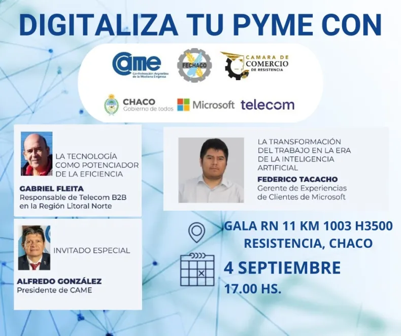 El evento, que surge a partir de un convenio entre TELECOM, Microsoft y CAME, contará con la disertación del Gerente de Experiencias de Clientes Microsoft, Federico Tacacho con su Conferencia "La Transformación del Trabajo en la Era de la Inteligencia Artificial"; y el responsable de Telecom B2B en la región Litoral Norte, Gabriel Fleita con su disertación sobre Tecnología como Potenciador de la eficiencia. Además, estará como invitado especial el presidente de CAME, Alfredo González.