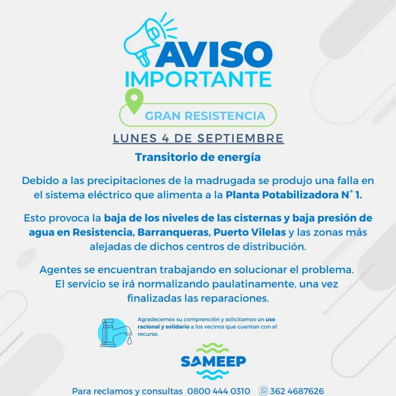 Desde la empresa Sameep informan baja presión de agua en el Gran Resistencia.