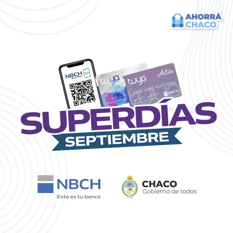 La promoción Superdías de Nuevo Banco del Chaco y el Gobierno Provincial seguirá durante el mes de septiembre para comprar con descuentos en comercios adheridos de la provincia con Tarjeta Tuya y Billetera NBCH24. Los martes y jueves –exclusivo para pasivos de Insssep-, el beneficio es de 30% en farmacias y los miércoles, de 50% en alimentos.