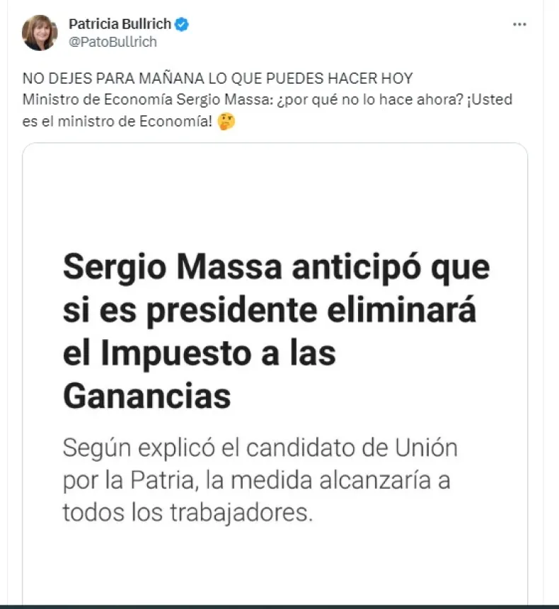 Bullrich a través de su cuenta oficial de la red X lanzó: "No dejes para mañana lo que puede hacer hoy Ministro de Economía Sergio Massa" y agregó: "¿Por qué no lo hace ahora? ¡Usted es el ministro de Economía!", disparó la candidata presidencial en medio de la contienda rumbo a las elecciones del 22 de octubre próximo.
