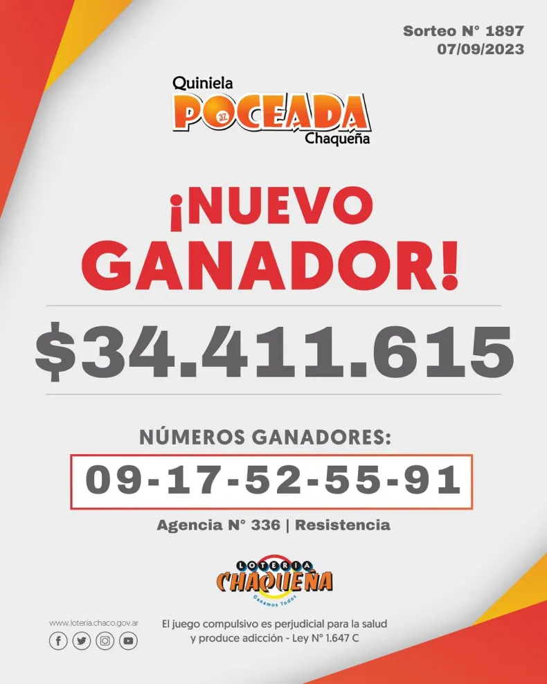 Se trató del sorteo número 1897 de la Poceada Chaqueña y en esta ocasión el ganador recibió un total de $ 34.411.615.