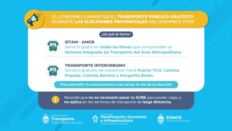 La Subsecretaria de Transporte, -dependiente del Ministerio de Planificación, Economía e Infraestructura- informa que, los pasajeros del Área Metropolitana del Gran Resistencia contarán con servicio de transporte gratuito este domingo 17 de septiembre, cuando se desarrollen las elecciones generales provinciales para Gobernador, Vicegobernador o Vicegobernadora, diputados y diputadas en la provincia del Chaco.
