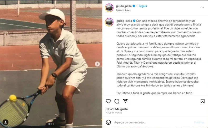 "Con una mezcla enorme de sensaciones y un alivio muy grande vengo a decir que decidí ponerle punto final a mi carrera como tenista profesional. Fue un viaje increíble, con muchas cosas lindas que me permitieron vivir momentos que no todos pueden y por eso voy a estar eternamente agradecido.