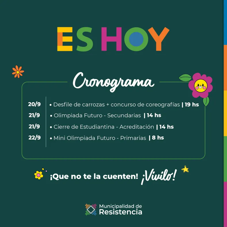 La ciudad de Resistencia, en el marco del Programa "Es Hoy", se prepara para el Día del Estudiante y la llegada de la primavera con las atracciones principales de la estudiantina que volverán al lugar donde brillaron históricamente. Este miércoles 20 de septiembre, desde las 19 horas, en inmediaciones de la plaza central se realizará el tradicional desfile de carrozas y el concurso de coreografías.
