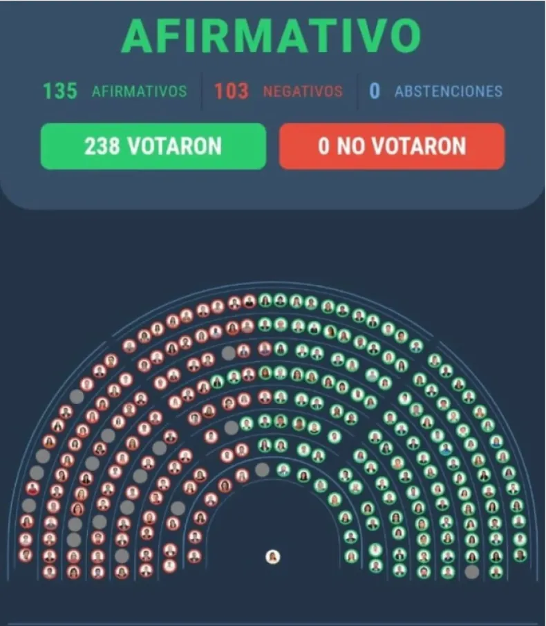 La votación que tuvo lugar pasadas las 21.30 obtuvo 135 votos a favor, 103 rechazos y cero abstenciones. El oficialismo, el bloque de Javier Milei, el peronismo federal y el Frente de Izquierda, fueron los que encabezaron la aprobación.