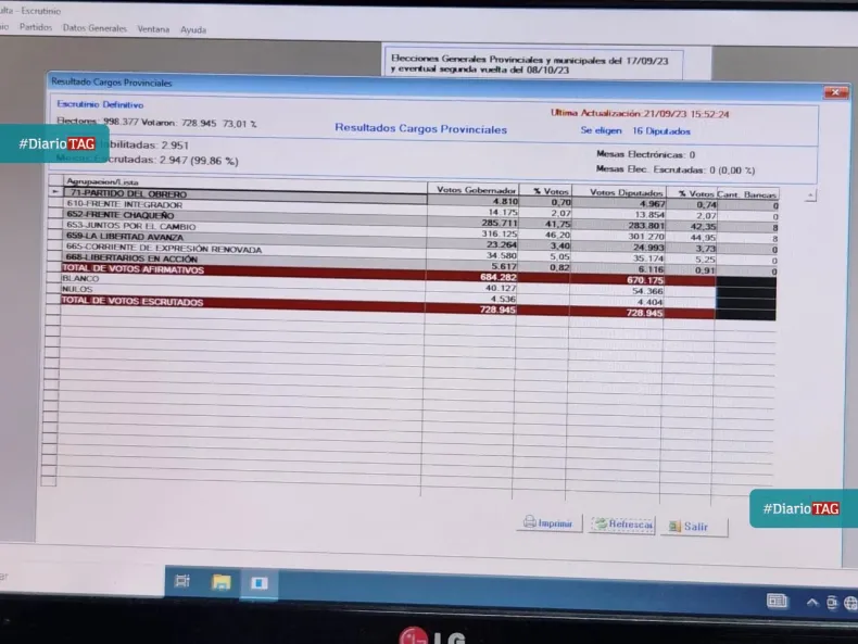 Juntos por el Cambio ahora registró 46,20%, es decir, un aumento de 750 votos. El Frente Chaqueño aumentó sólo 0,01%, lo que significa una diferencia de 309 votos.