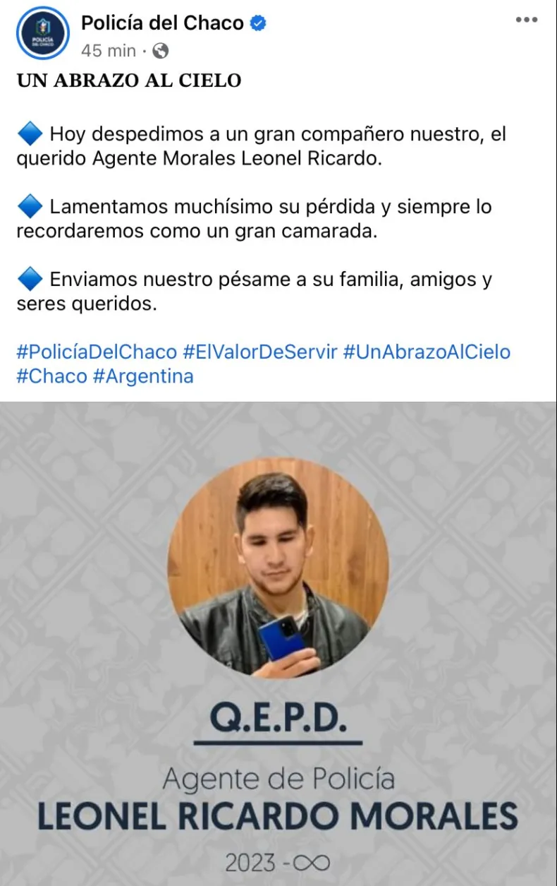 "Hoy despedimos a un gran compañero nuestro, el quedo agente Morales Leonel Ricardo. Lamentamos muchísimo su pérdida y siempre lo recordaremos como un gran camarada. Enviamos nuestro pésame a su familia, amigos y seres queridos", manifestaron mediante redes sociales.