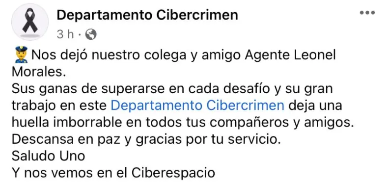 "Nos dejó nuestro colega y amigo, el agente Leonel Ricardo Morales. Las ganas de superarse en cada desafío y su gran trabajo en este Departamento de Cibercrimen dejan una huella imborrable en todos tus compañeros y amigos. Descansa en paz y gracias por tu servicio, nos vemos en el ciberespacio", expresaron desde el departamento.