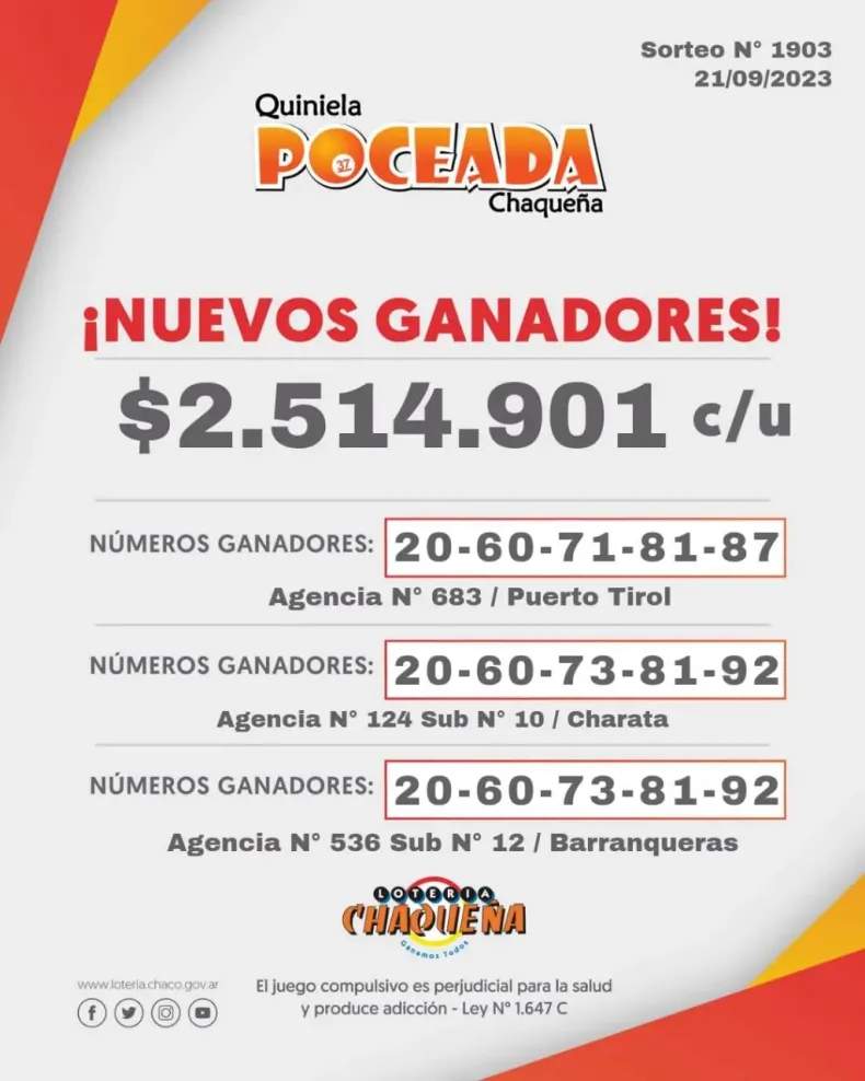 Finalmente, un tercer ganador se dividió el pozo este jueves en la localidad de Barranqueras. La suerte le llegó con los números 20, 60, 73, 81 y 92, jugado en la agencia N°536, subagencia N°12 de la localidad.