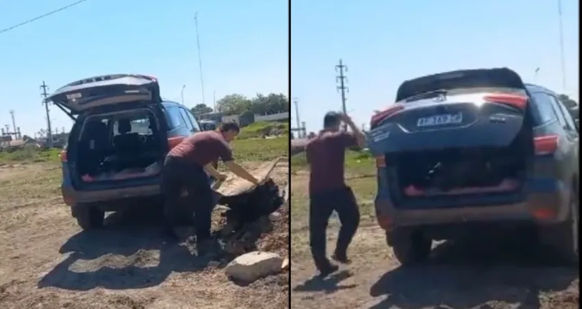 El hombre finalmente, terminó levantando toda la basura tirada anteriormente y ante la insistencia de la vecina, cierra el baúl y hace un gesto con las manos y finalmente se sube a su auto.