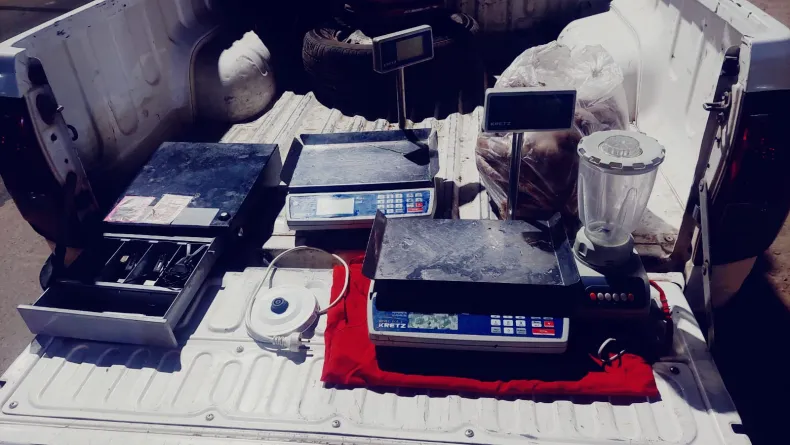 Los delincuentes tenían en su poder una caja registradora, una base de pava eléctrica, una licuadora, dos balanzas digitales, un delantal, una bolsa trasparente con 17 kilogramos de chorizo. Estos elementos coincidían con lo denunciado por el comerciante damnificado y procedieron al secuestro y traslado de los elementos.