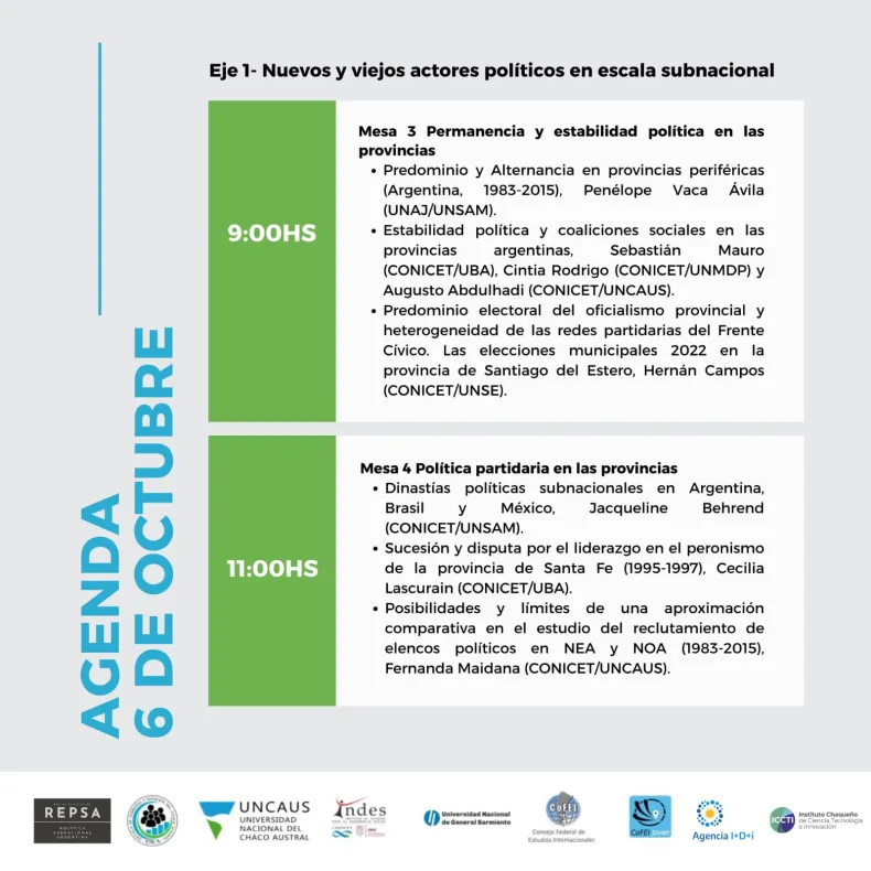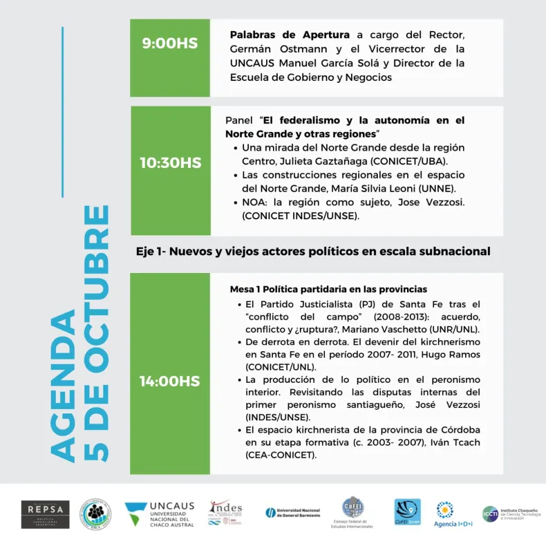 Se trata de la primera edición de estas Jornadas en NEA y en Chaco. A través de la ENCA de la UNCAUS, en coorganización con la Red de Estudios de Política Subnacional (REPSA), la provincia será sede de este importante evento académico. Los investigadores provenientes de distintas universidades e instituciones del país, discutirán avances y aproximaciones desde la sociología, la historia, la ciencia política y la antropología, y el intercambio buscará, además, promover vinculaciones con instituciones y profesionales locales.