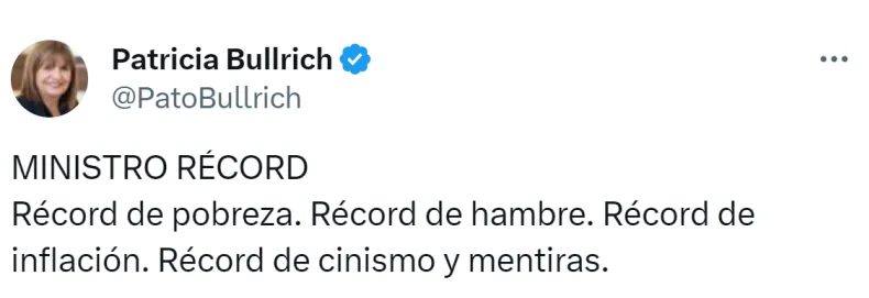 En tanto, la candidata presidencial de Juntos por el Cambio (JxC), Patricia Bullrich apuntó: "Ministro récord", en alusión directa a la administración de Massa. "Récord de pobreza. Récord de hambre. Récord de inflación. Récord de cinismo y mentiras", completó la exministra por Twitter.