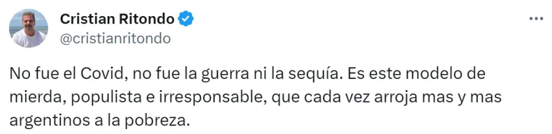 En la misma línea se manifestó el diputado nacional de JxC Cristian Ritondo: "No fue el Covid, no fue la guerra ni la sequía. Es este modelo de m....., populista e irresponsable, que cada vez arroja más y más argentinos a la pobreza", publicó.