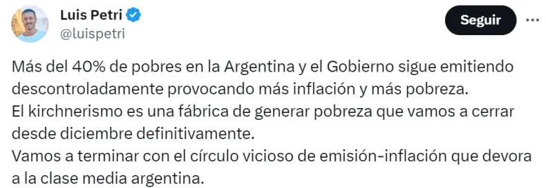 Por su parte, su candidato a vicepresidente, Luis Petri, escribió: "Más del 40% de pobres en la Argentina y el Gobierno sigue emitiendo descontroladamente provocando más inflación y más pobreza".