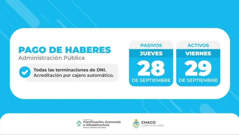 En tanto, los sueldos de los trabajadores activos se pagarán el viernes, cuando tendrán disponibles sus haberes en cajeros automáticos del NBCH. A partir del lunes siguiente, podrán retirar sus sueldos por ventanilla en las sucursales habilitadas por el banco provincial.