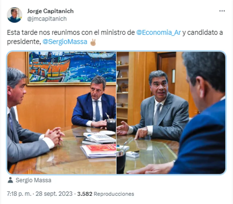 "Esta tarde nos reunimos con el ministro de Economía y candidato a presidente, Sergio Massa", fueron las palabras de Capitanich en sus redes sociales.