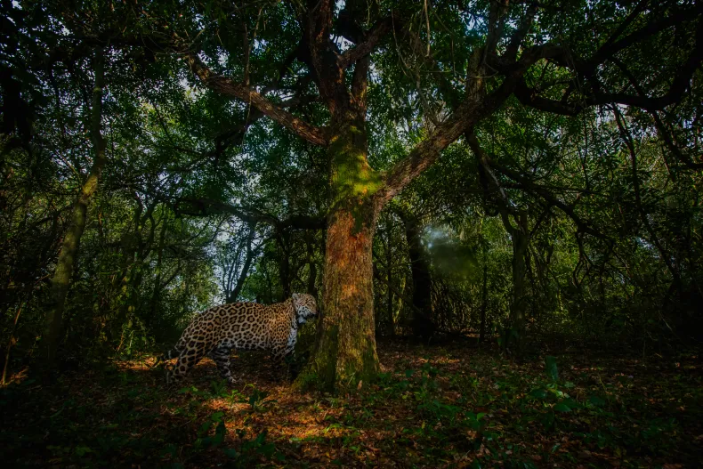 El yaguareté (Panthera onca) es el mayor felino del continente americano —los machos llegan a pesar hasta 140 kilos—y está categorizado como en Peligro Crítico de Extinción en Argentina principalmente debido a la cacería, disminución de la abundancia de sus presas y a la destrucción y fragmentación de su hábitat. Con una población estimada en 200-250 individuos, la especie ocupa menos del 5% de su área de distribución histórica en Argentina.