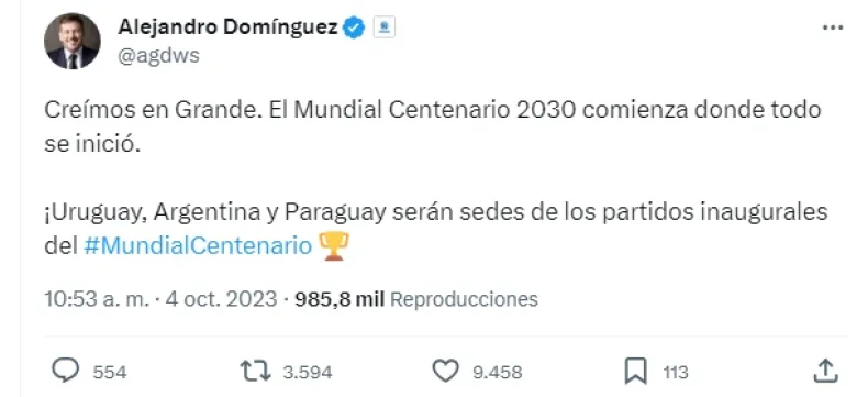 "Creímos en Grande. El Mundial Centenario 2030 comienza donde todo se inició. ¡Uruguay, Argentina y Paraguay serán sedes de los partidos inaugurales del #MundialCentenario", señaló Domínguez en sus redes sociales.