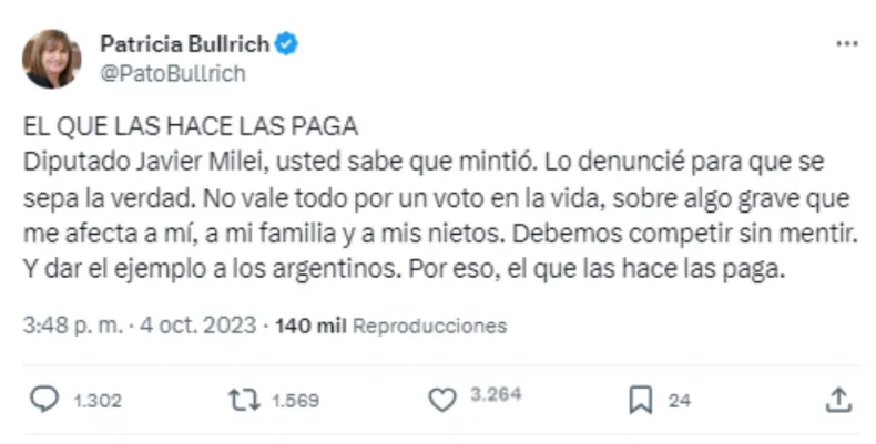 La exministra de Seguridad de la Nación Patricia Bullrich realizó dos denuncias penales contra el candidato a presidente de La Libertad Avanza. Las presentaciones judiciales se deben a los dichos de Milei al afirmar que la titular del PRO era "montonera" y "tira bomba". Frente a estas declaraciones la representante de Juntos por el Cambio inició acciones legales por calumnias e injurias y por intimidación pública e incitación al odio.
