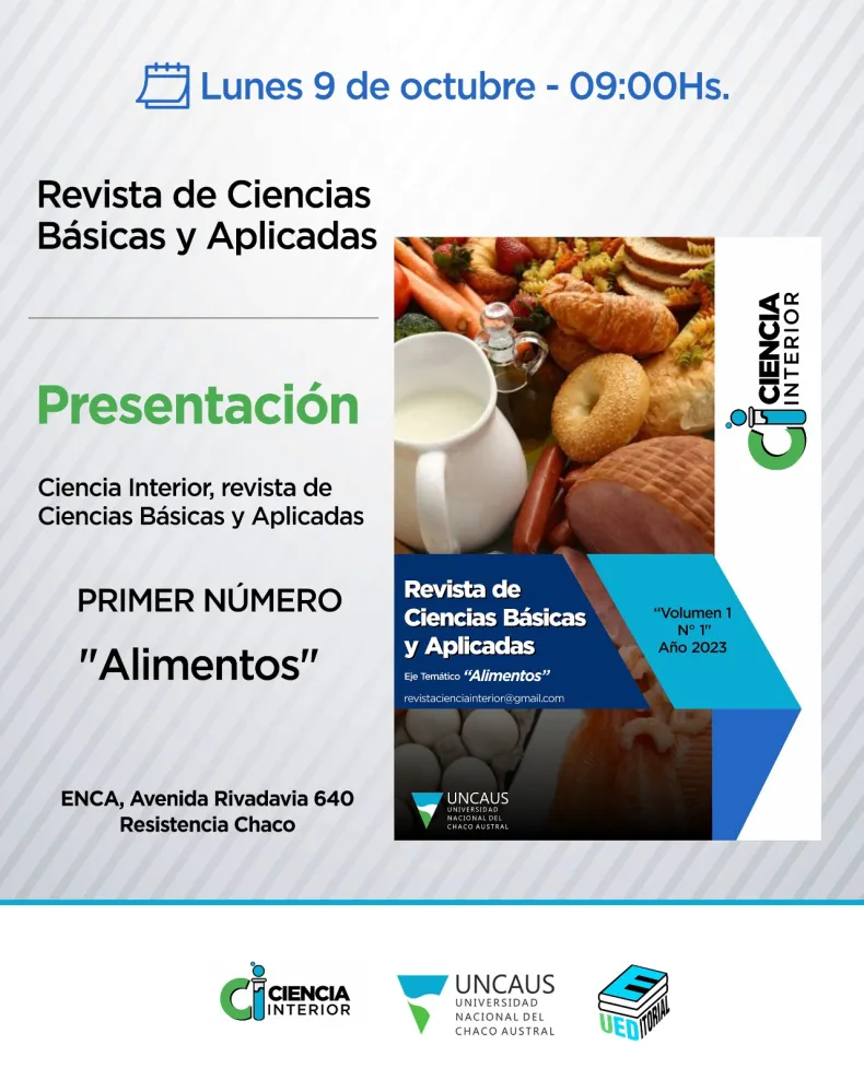 El próximo 9 de octubre de 2023, se presentará de manera formal el primer número de "Ciencia Interior", la revista de divulgación científica de Ciencias Básicas y Aplicadas de la Universidad Nacional del Chaco Austral, editada por la propia editorial. Se realizará a las 9 de la mañana, en la Escuela de Gobierno y Negocios del Chaco Austral (ENCA), ubicada en la Avenida Rivadavia N° 640 de la localidad de Resistencia, Chaco.
