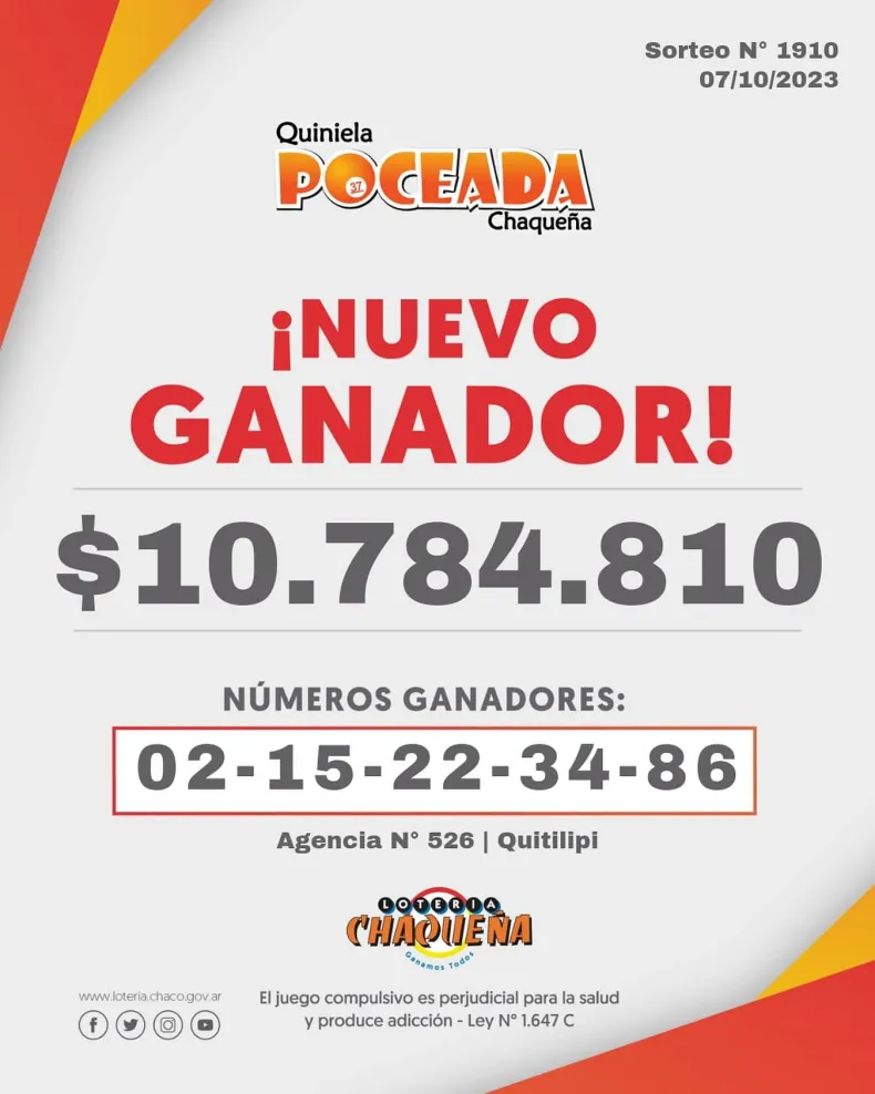 Se trató del sorteo número 1910 de la Poceada Chaqueña y en esta ocasión el ganador recibió un total de $ 10.784.810.