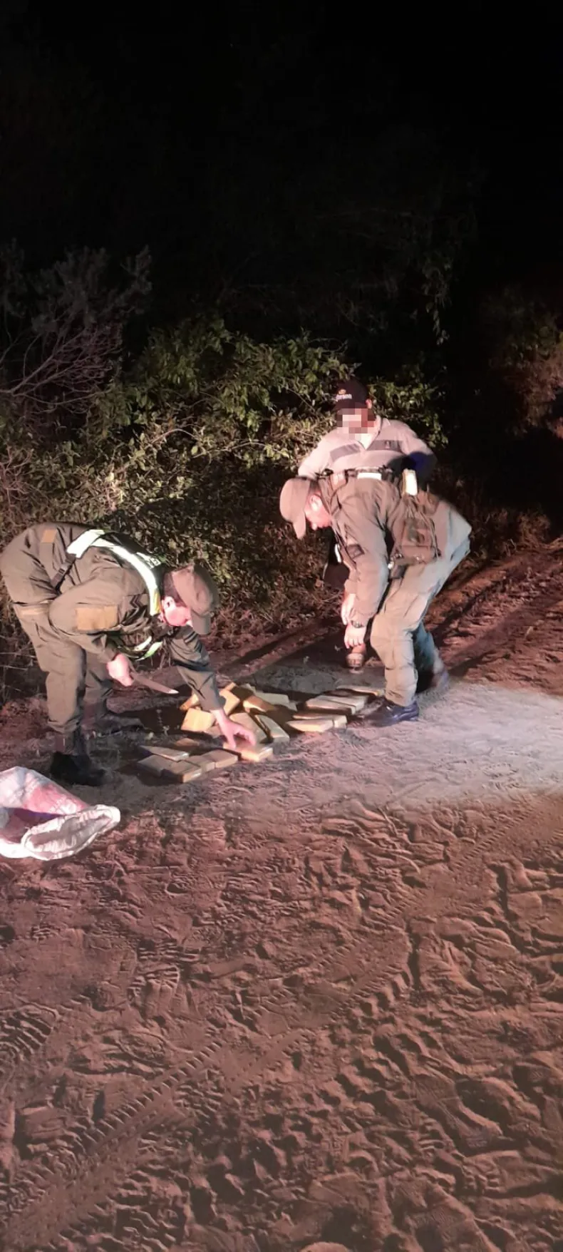 Inmediatamente, se inició un seguimiento controlado en medio de una zona con poca iluminación que culminó con el hallazgo de una bolsa tipo arpillera en un camino secundario.
