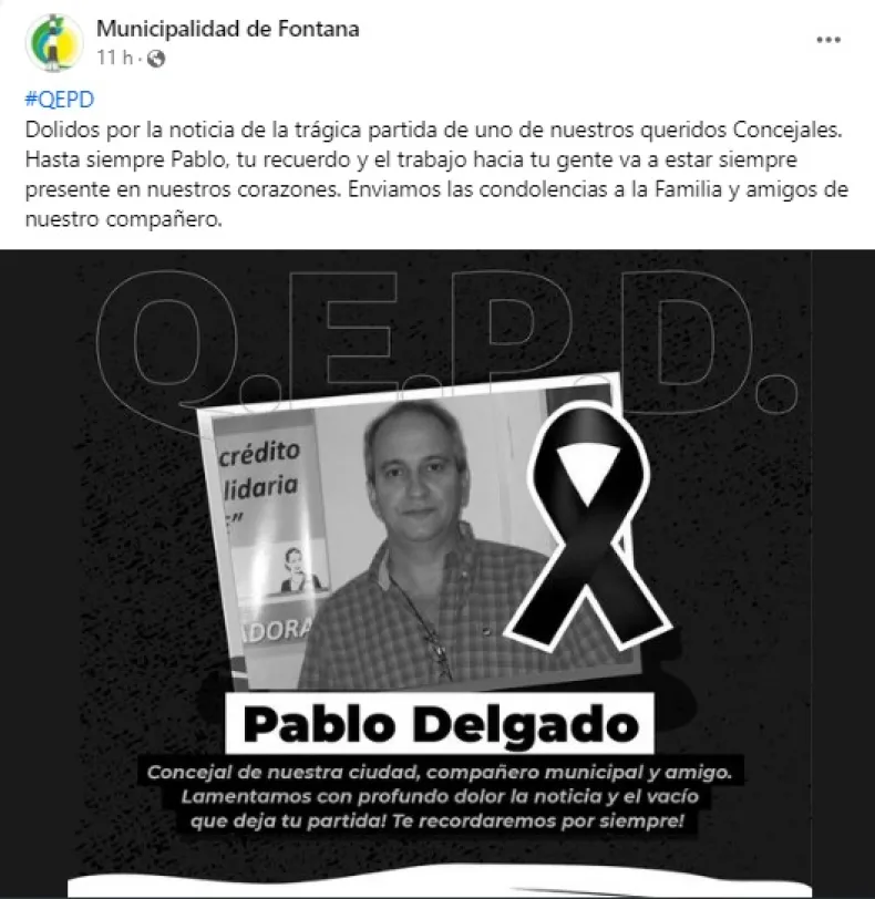 Desde la Municipalidad de Fontana, escribieron en sus redes sociales un mensaje: "Dolidos por la noticia de la trágica partida de uno de nuestros queridos Concejales. Hasta siempre Pablo, tu recuerdo y el trabajo hacia tu gente va a estar siempre presente en nuestros corazones. Enviamos las condolencias a la Familia y amigos de nuestro compañero".