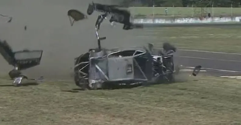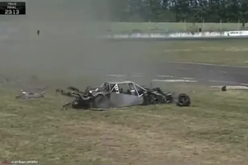 El piloto de 19 años, Ulises Campillay, debutaba hoy en la categoría y fue protagonista del fuerte choque: impactó contra otro de los autos y salió disparado por el aire. Al caer, el vehículo dio al menos seis o siete vueltas y terminó destrozado.