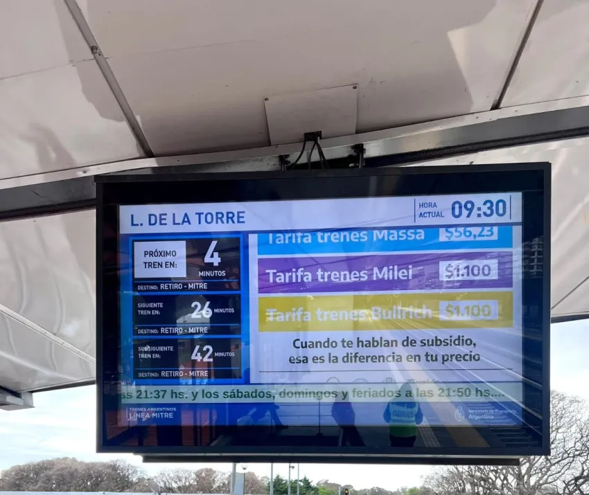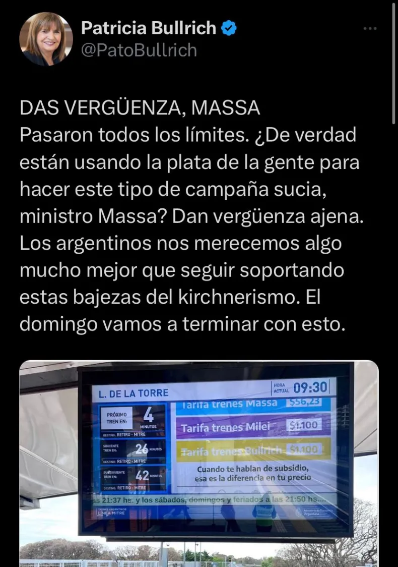 Patricia Bullrich se refirió vía X (antes Twitter) a los carteles que aparecieron en las pantallas de los trenes argentinos esta mañana, los mismos hacen referencia al valor del boleto con y sin subsidio, y de esta manera la candidata a presidente de Juntos por el Cambio acusó a Sergio Massa de hacer "una campaña sucia".