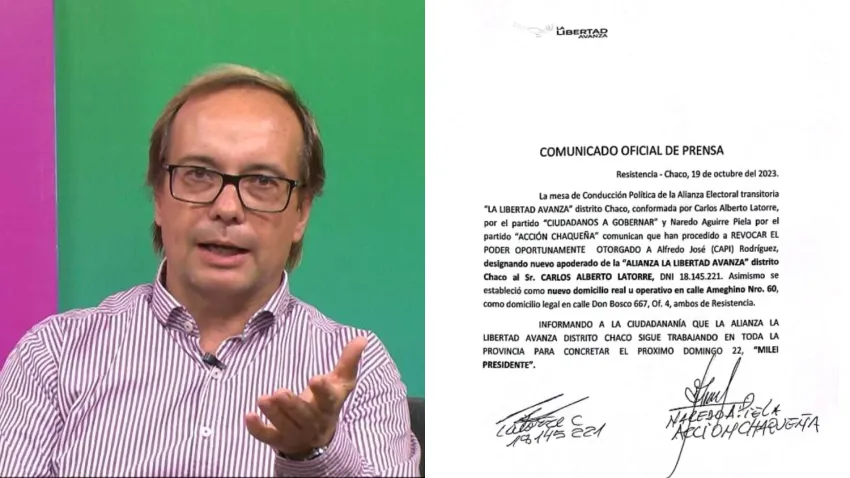 Este jueves, la mesa de Conducción Política de la Alianza Electoral transitoria "La Libertad Avanza" distrito Chaco lanzó un comunicado en donde informa la destitución de su apoderado Alfredo "Capi" Rodríguez. Carlos Alberto Latorre, será quien tome el rol vacante.