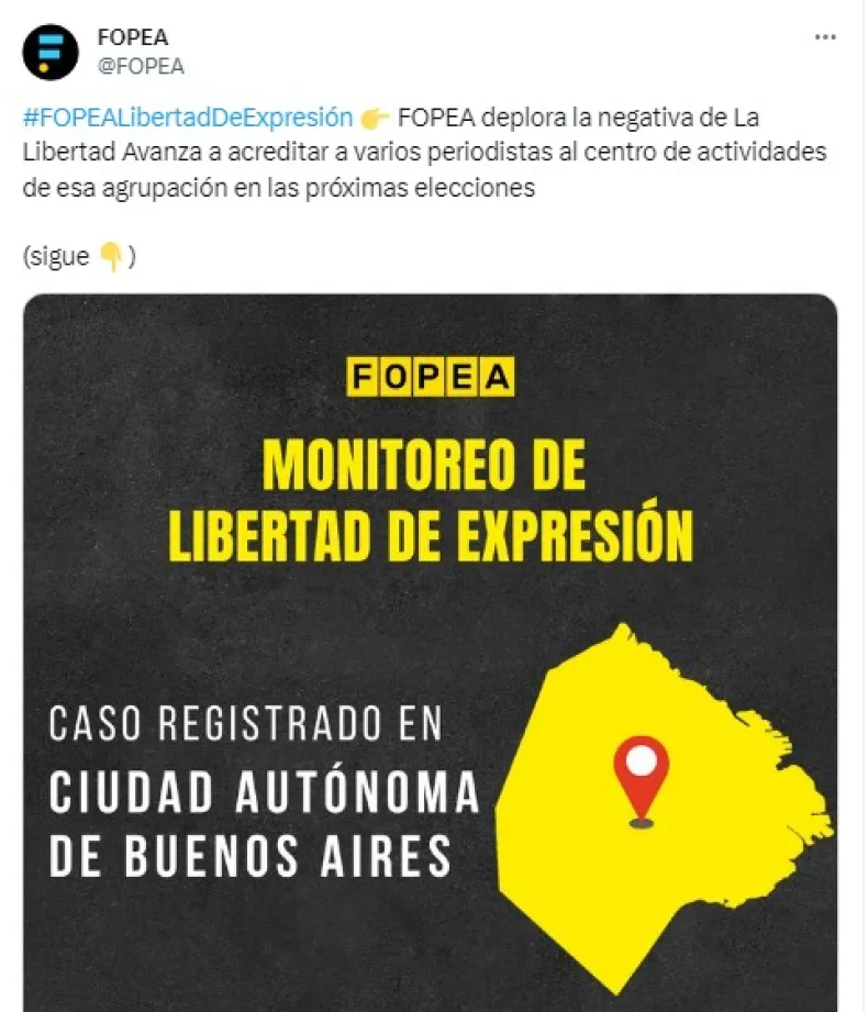 Desde el Foro de Periodismo Argentino (FOPEA) realizaron un comunicado a través de sus redes sociales, más específicamente desde X (anteriormente Twitter) para lamentar la negativa del partido político para acreditar a varios periodistas en las elecciones de este domingo 22.