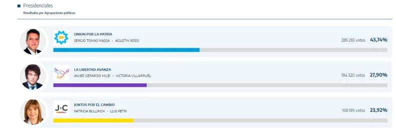 Unión por La Patria obtuvo un total un 43,74% lo que convierte a Sergio Massa en el candidato más votado.