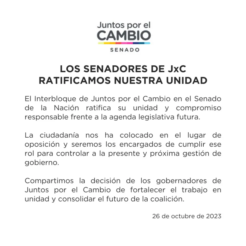 "El interbloque de Juntos por el Cambio en el Senado de la Nación ratifica su unidad y compromiso responsable frente a la agenda legislativa futura", comienzan explicando en el escrito.