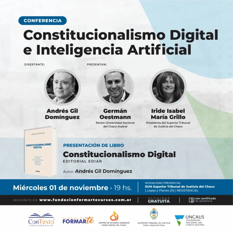 La Universidad Nacional del Chaco Austral invita a participar de esta nueva propuesta gratuita, que contará con la presentación del libro "Constitucionalismo Digital", a cargo del Abg. Andrés Gil Domínguez. Participarán de la presentación, además, el rector de la UNCAUS, Germán Oestmann; y la presidente del Superior Tribunal de Justicia de Chaco, Iride Isabel María Grillo.